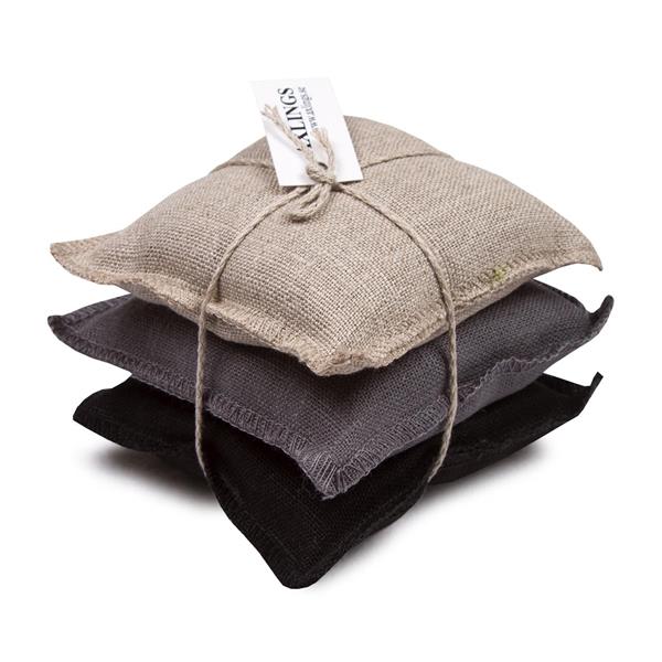Tre lavendelkuddar av lin fyllda med fransk lavendel. Lavendel har många positiva egenskaper. Förutom god och fräsch doft i linneskåp så är lavendel lugnande. Dessutom skyr småkryp och insekter doften. varför lavendel sedan urminnes tider använts för att hålla dem borta. Ett tips är att alltid ha med några lavendelkuddar i resväskan för att minimera risken att objudna gäster av misstag följer med hem.