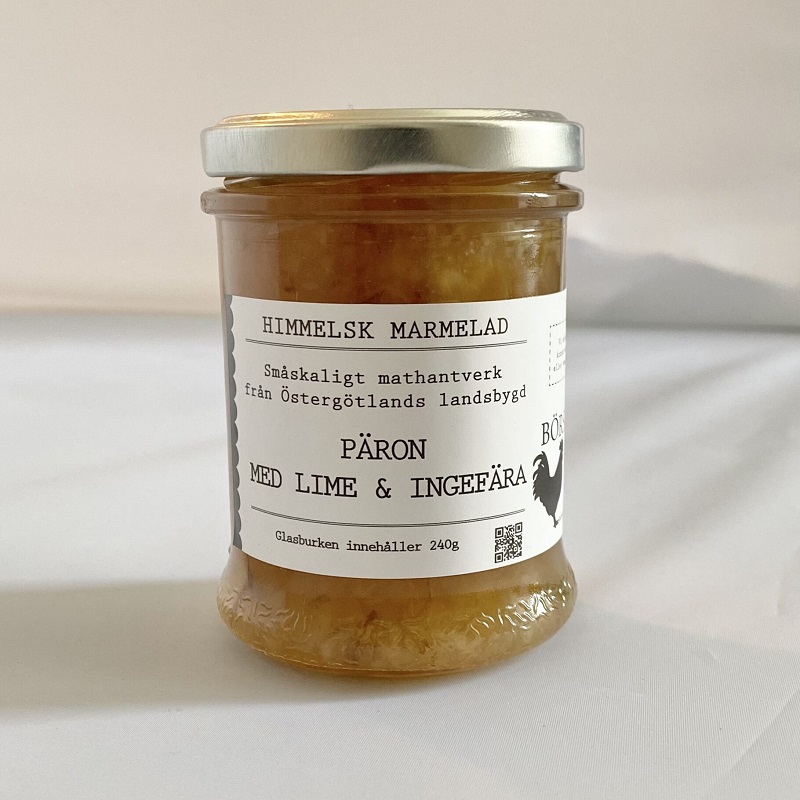 Ingredienser: Socker, Päron 24%, Äpplen 10%, Ingefära 3,5%, Lime 2,5%, Citron, Pektin.