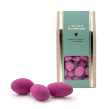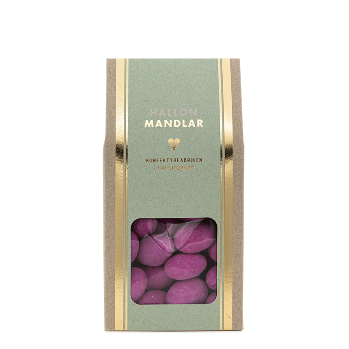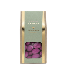 Mandel dragerad med mjölkchoklad och sockeröverdrag med hallonsmak.
