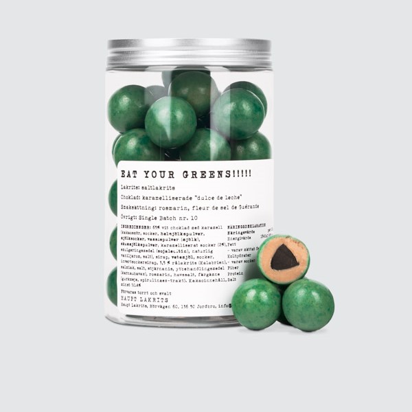 Ingredienser: 65% vit choklad med karamell (kakaosmör, socker, helmjölkspulver, mjölksocker, vasslepulver (mjölk) , skummjölkspulver, karamelliserat socker (2%), emulgeringsmedel (sojalecitin), naturlig vaniljarom, salt), sirap, vetemjöl, socker, invertsockersirap, 3,5 % rålakrits (Kalabrien), salmiak, salt, stjärnanis, ytbehandlingsmedel (karnaubavax), rosmarin, havssalt (fleur de sel de Guérande), färgämne (gurkmeja, spirulinaextrakt). Kakaoinnehåll, minst 30.4%.