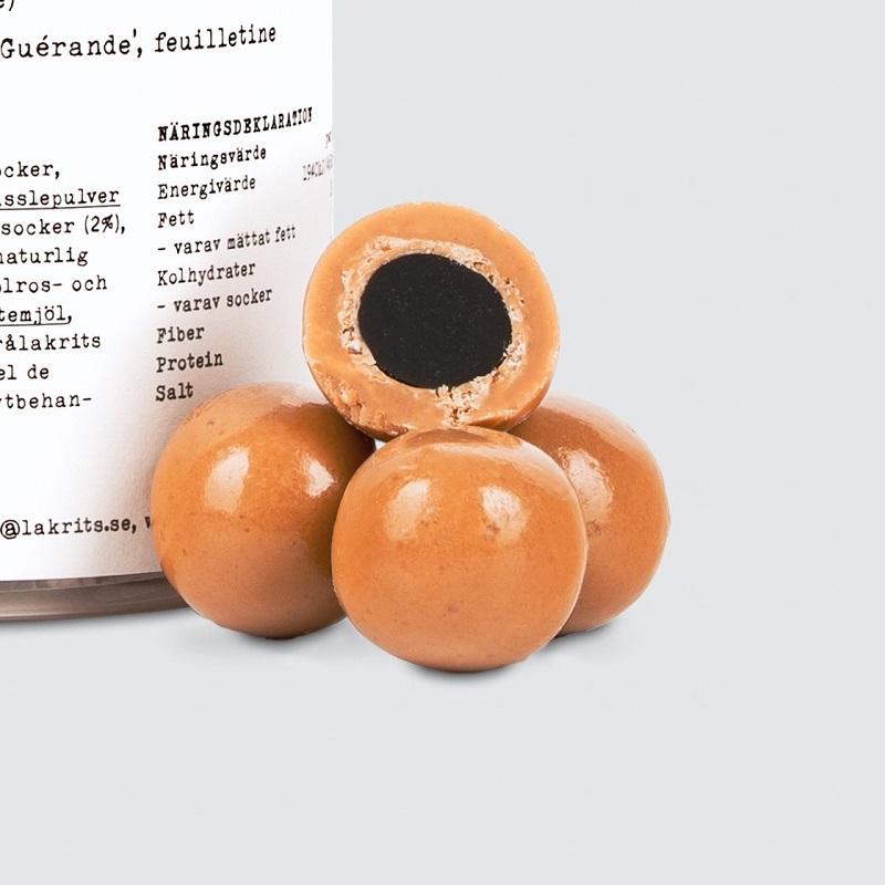 Långkokt saltlakrits omgiven av karamelliserad dulcechoklad och smaksatt med krispig feuilletine samt franskt havssalt.