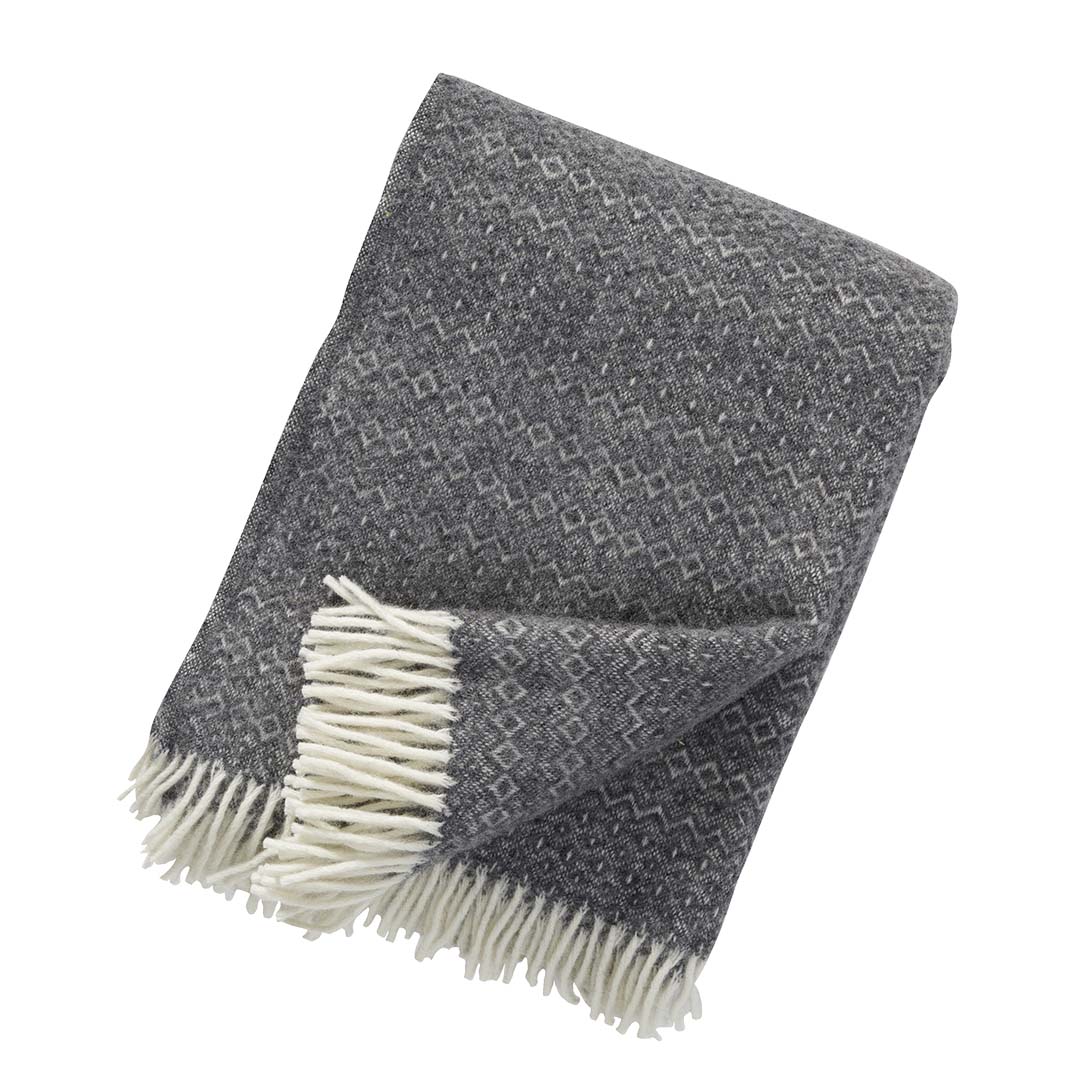 Mysiga ullpläden Hekla från Klippan Yllefabrik är detaljrikt mönstrad och har fransar i vitt. Pläden är lika snygg i soffan som på sängen eller uteplatsen och är tillverkad i ren ekologisk lammull av högsta kvalitet – ett bra val för både dig och lammen.