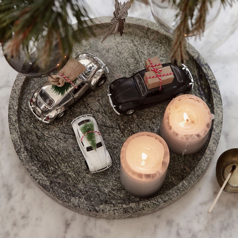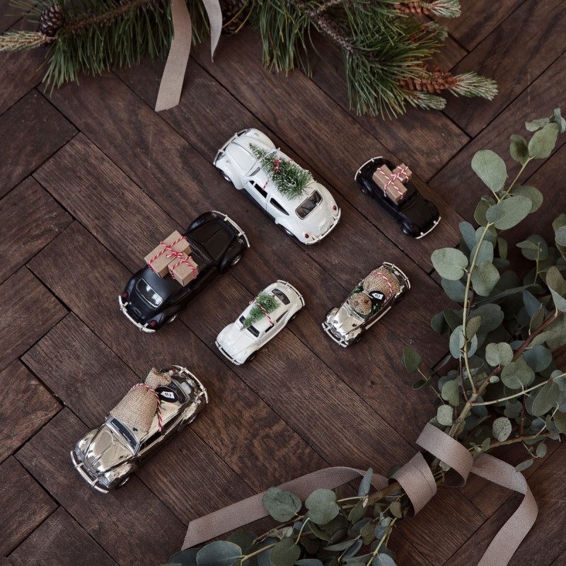 Julbilen i en blank silverfärg som kommer att ge karaktär till dina redan befintliga juldekorationer. På toppen av den underbara bilen finns en liten julklappssäck och en gran. Bilen är ett perfekt komplement till jullandskapet eller som ett snyggt element i adventsljusstaken.