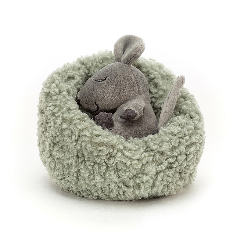 Smyg närmare och ta en titt, kan du höra en minimal liten snarkning? Denna övervintrande lilla mus sover så sött! Denna lilla hoprullade mus har gjort sig ett gosigt grågrönt bo eller rede som den kan krypa ner i och ta sig en bekväm lur. Med sina blundande ögon, gulliga små öron, den söta svansen instoppad och den sammetsmjuka grå pälsen samt mörkgrå små tassarna rengjorda drömmer denna lilla sömntuta nu som bäst. En bra kompis att ha vid läggdags om du har svårt att komma till ro.