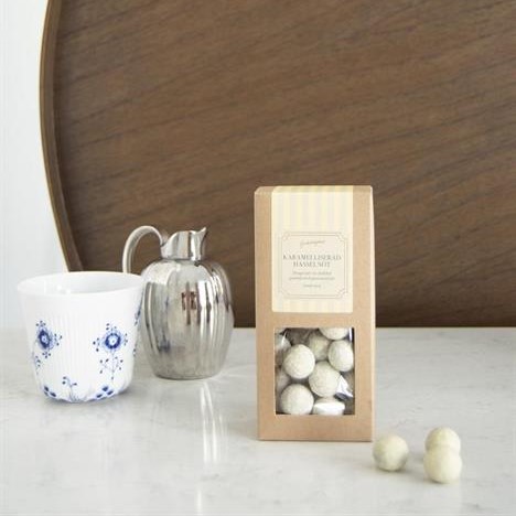 Karamelliserad hasselnöt dragerad i vit choklad pudrad med passionsfrukt.
