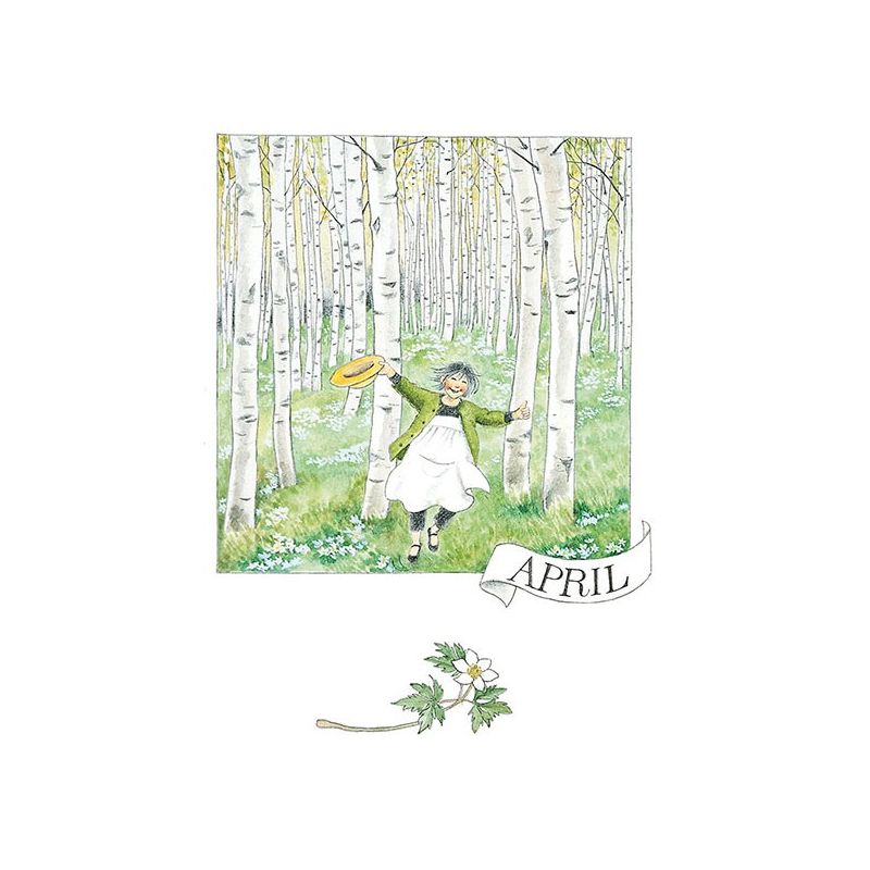 Månadsbild april, hämtade från boken Linneas årsbok. Illustrationer av Lena Anderson.