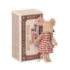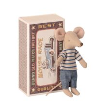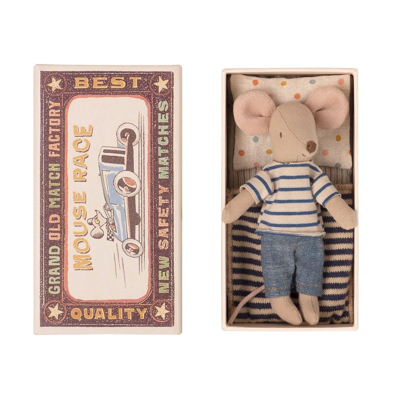 Musen storebror från Maileg älskar att sova i sin tändsticksask. Där kan han bädda ner sig ordentligt med både täcke och kudde.