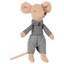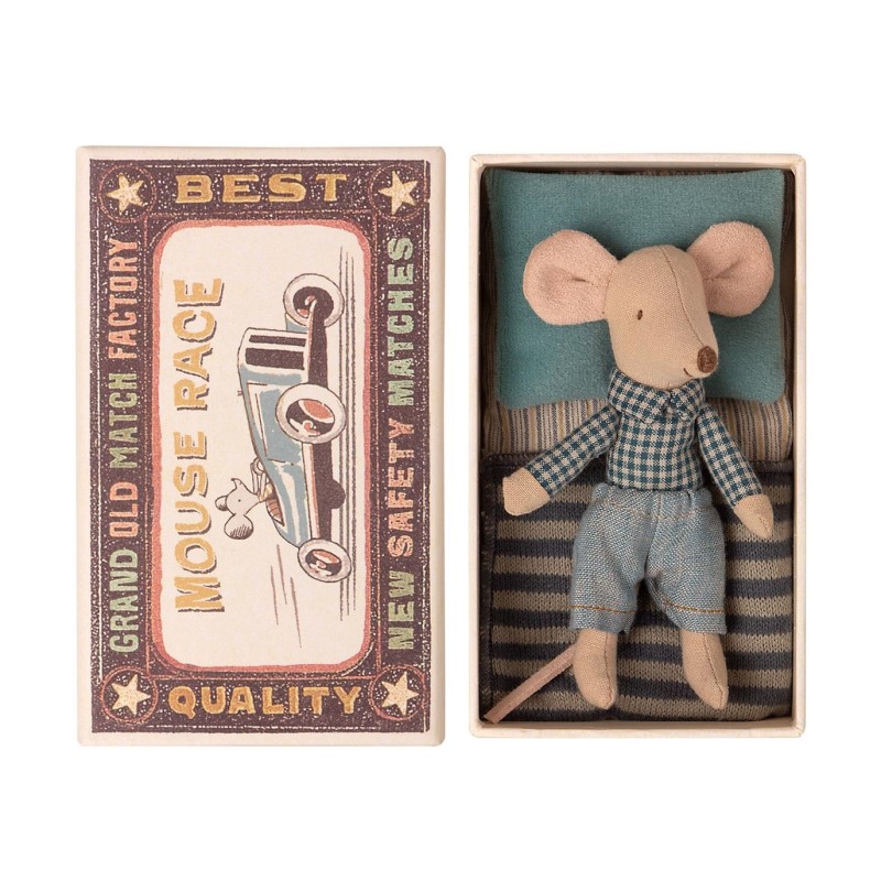 Musen lillebror från Maileg älskar att sova i sin tändsticksask. Där kan han bädda ner sig ordentligt med både täcke och kudde. Den här lille killen bär ett par små söta byxor.