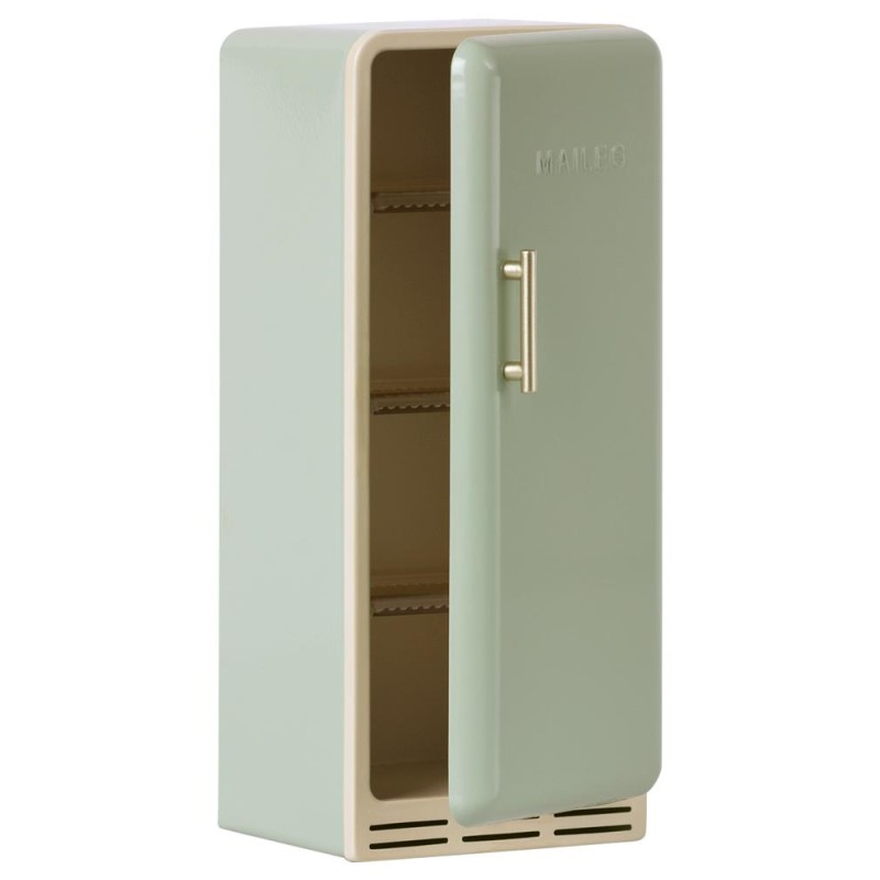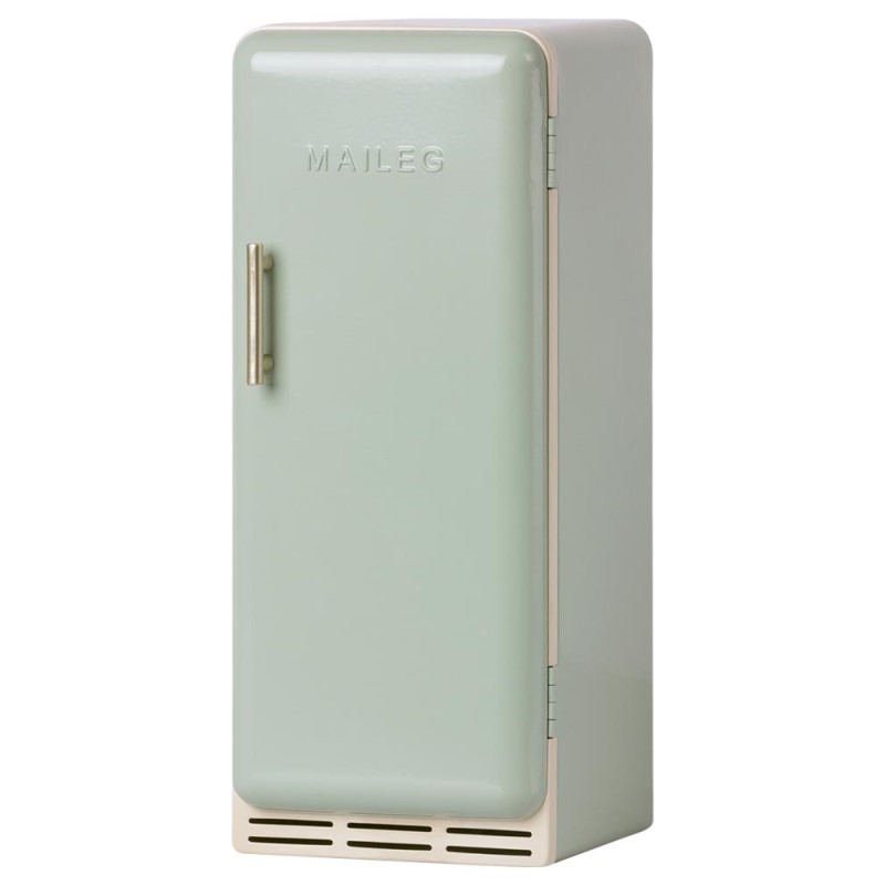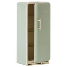 Ett kylskåp i retrostil. Passar perfekt till din kaniner och möss. Kylskåpet är tillverkat i metall med magnetlås och frostade hyllor inuti. Ett bra tillbehör till detta kylskåp är Miniature grocery box.