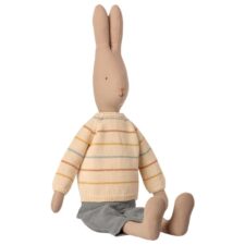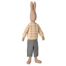 Tillverkad i mjukt naturligt linne och bomullstyg vilket ger en härlig känsla och utseende. Den här kaninen är klädd i en vacker randig tröja och mjuka byxor.