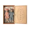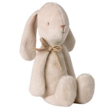 En liten mjuk kanin perfekt gjord för små händer. Den är gjord av polyester och har en färgad rosett runt halsen. Detta är den perfekta babyshower gåvan eller en ”välkommen till världen” gåva.