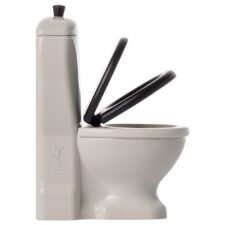 En toalett till badrummet. Den är vackert gjord i en benvit färg med en svart sits. Sitsen kan öppnas och stängas, och en dragfunktion i handtaget gör den väldigt verklig och lekfull. Den är perfekt i storleken för musfamiljen.