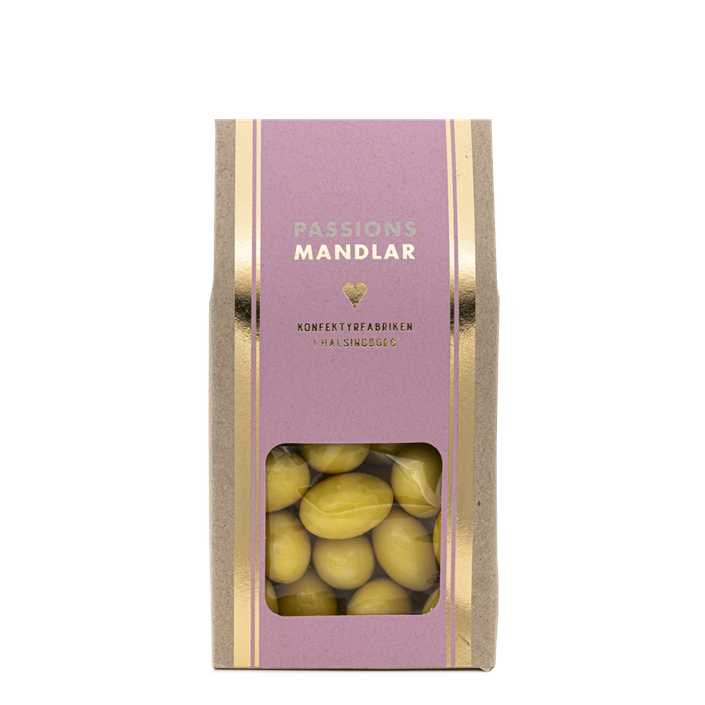 Ingredienser: Socker, MANDEL (20 %), kakaosmör, HELMJÖLKSPULVER, VASSLEPULVER, LAKTOS, koncentrerad passionsjuice, surhetsreglerande medel (äppelsyra, natriummalat), emulgeringsmedel (SOJALECITIN), naturlig passions arom, naturlig vanilj arom, färgämne (växtfärgskoncentrat, safflor), ytbehandlingsmedel (E904), glukossirap, modifierad tapiokastärkelse, vegetabiliska oljor (kokos, raps) i varierande proportion.
