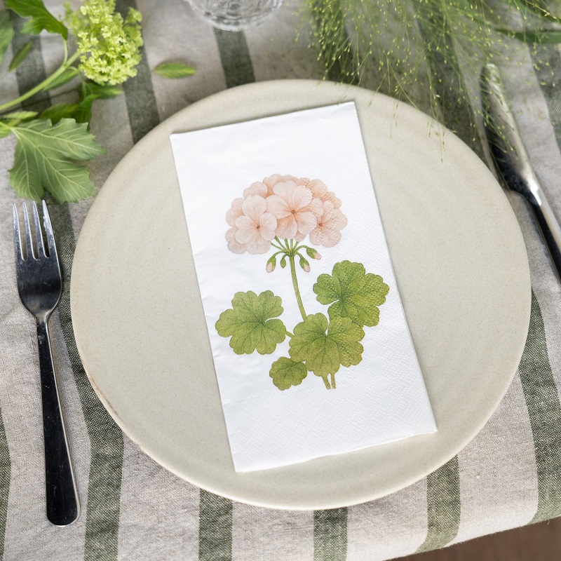 Pappersservett med pelargonmotiv. En stilren servett som passar fint till vårens och sommarens alla dukningar.