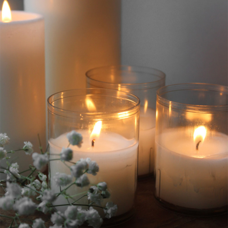Material: Kopp i transparent plast och bomullsveke, ljusmassa i en blandning av paraffin och stearin.